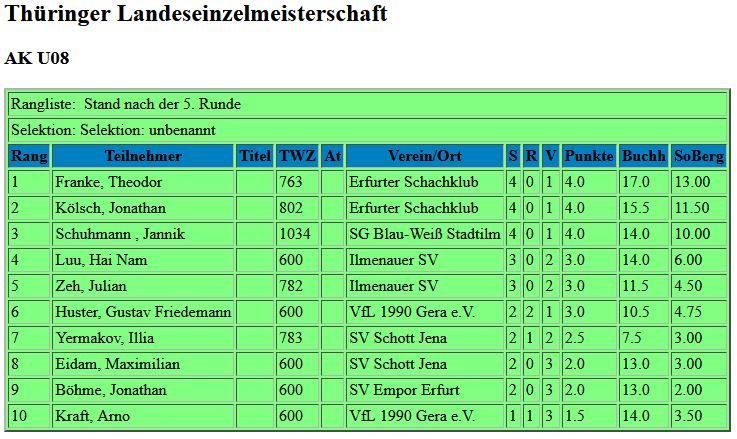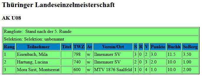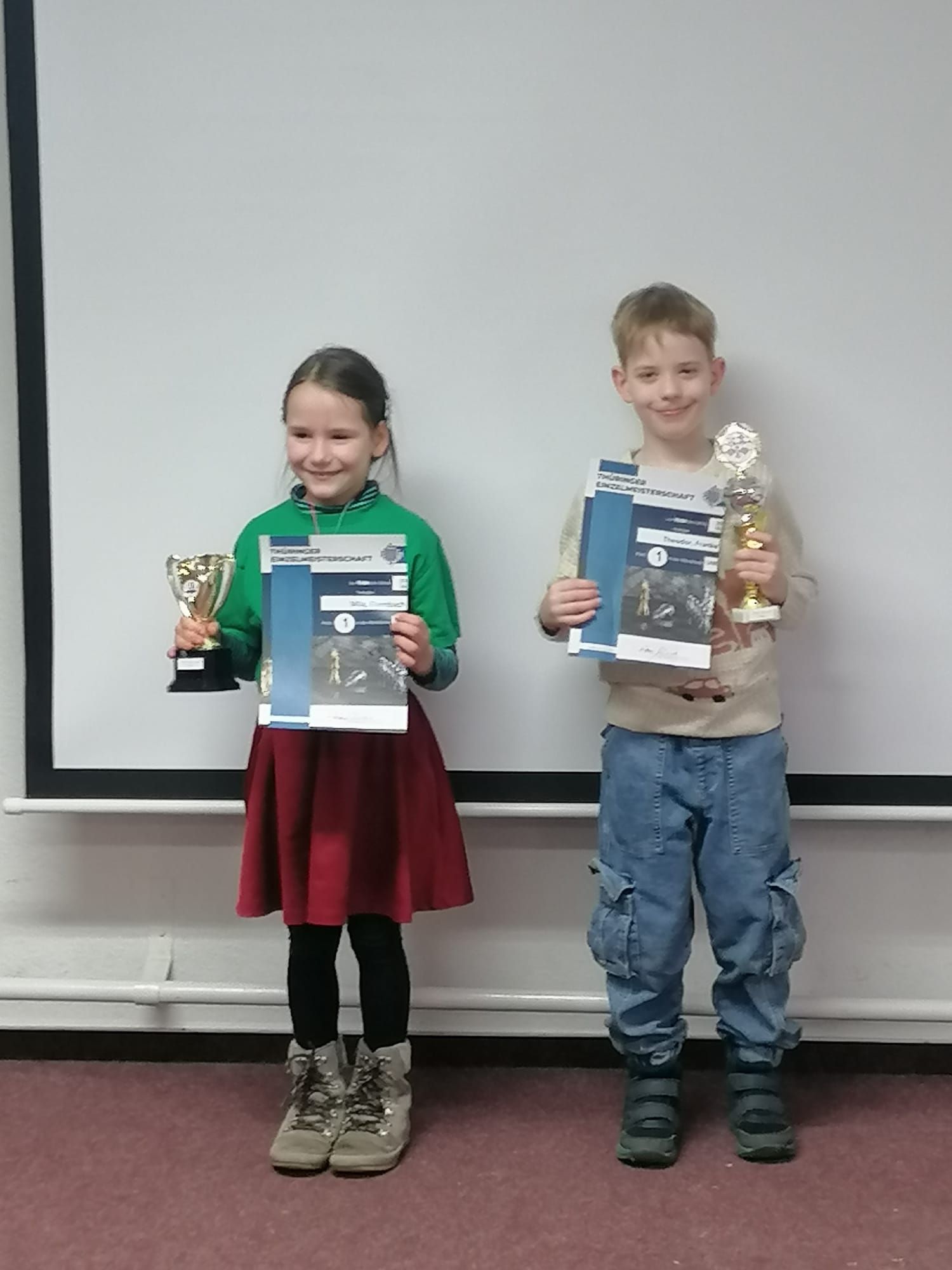 Sonntag halb 12 war es vorbei, die jeweiligen Sieger bei den Jungs und Mädchen standen fest. Bei den Mädchen blieb es wie bereits Samstag vermutet bei einem Durchmarsch von Mila. Somit kann sich Mila nun Thüringer Landesmeisterin der Altersklasse U08 nennen.