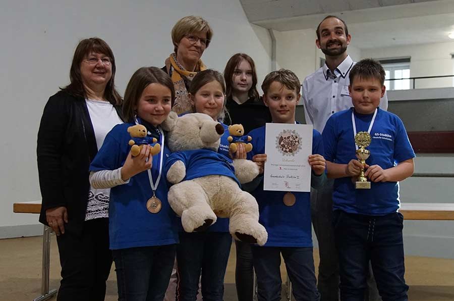 Einen sensationellen 3. Platz erkämpfte sich heute in der Thüringenhalle Erfurt das Team der Grundschule Stadtilm 1 mit Eric Langer, Lukas Schäfer, Eva-Lina Hoffmann und Amélie Richter. Insgesamt nahmen in der Wertungsklasse der Grundschulen 80 thüringer Mannschaften teil. Über einen fantastischen 6. Platz in der Wertung der 1./2. Klasse können sich die Schacheleven der 2. Mannschaft der GS Stadtilm freuen. Somit haben sich die kleinen Denker bei der Mannschaften zu den Deutschen Schulschachmeisterschaften im Mai in Friedrichroda qualifiziert..
