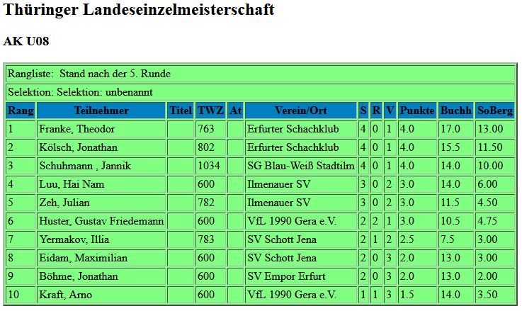 Sonntag halb 12 war es vorbei, die jeweiligen Sieger bei den Jungs und Mädchen standen fest. Bei den Mädchen blieb es wie bereits Samstag vermutet bei einem Durchmarsch von Mila. Somit kann sich Mila nun Thüringer Landesmeisterin der Altersklasse U08 nennen.